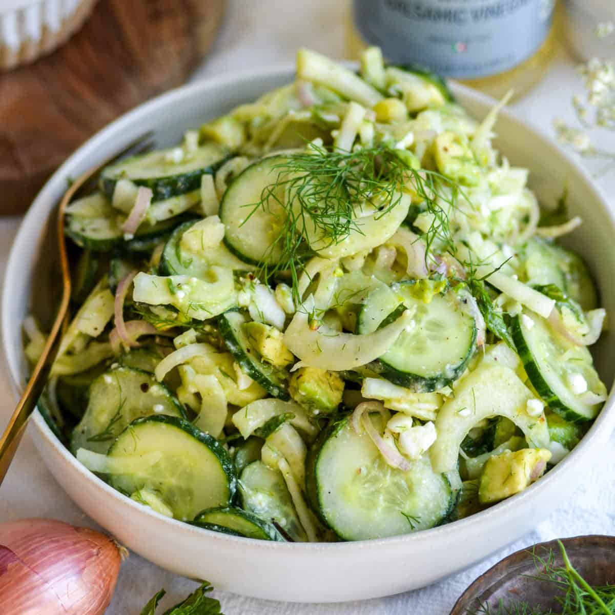 Fennel Cucumber Salad is crunchy, flavorful and delicious! It is full of shaved fennel, sliced cucumber, avocado and feta cheese.