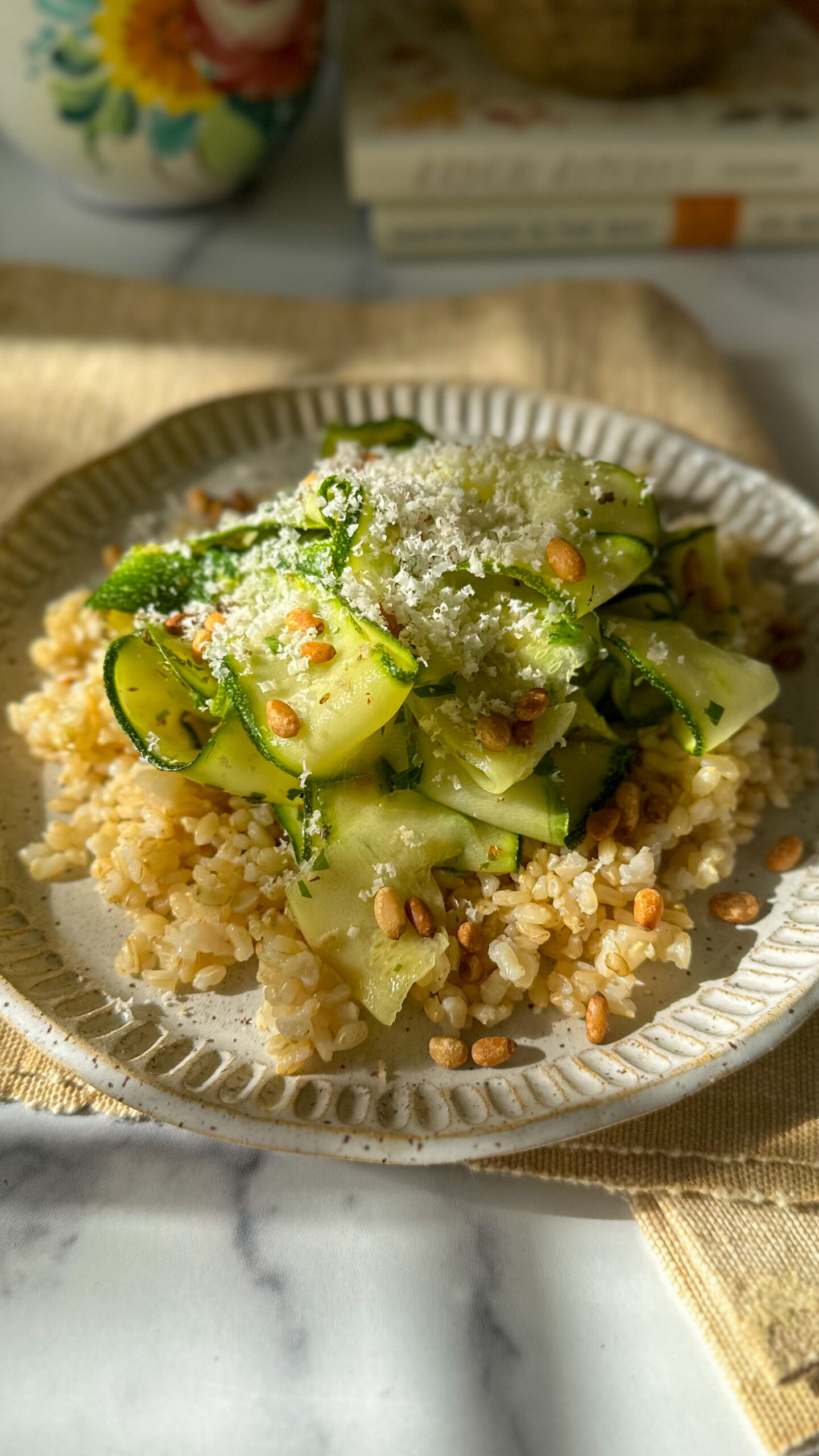 Indulge in the delightful and simple Italian flavors of this vegan Shaved Zucchini Salad with zesty lemon dressing, toasted pine nuts