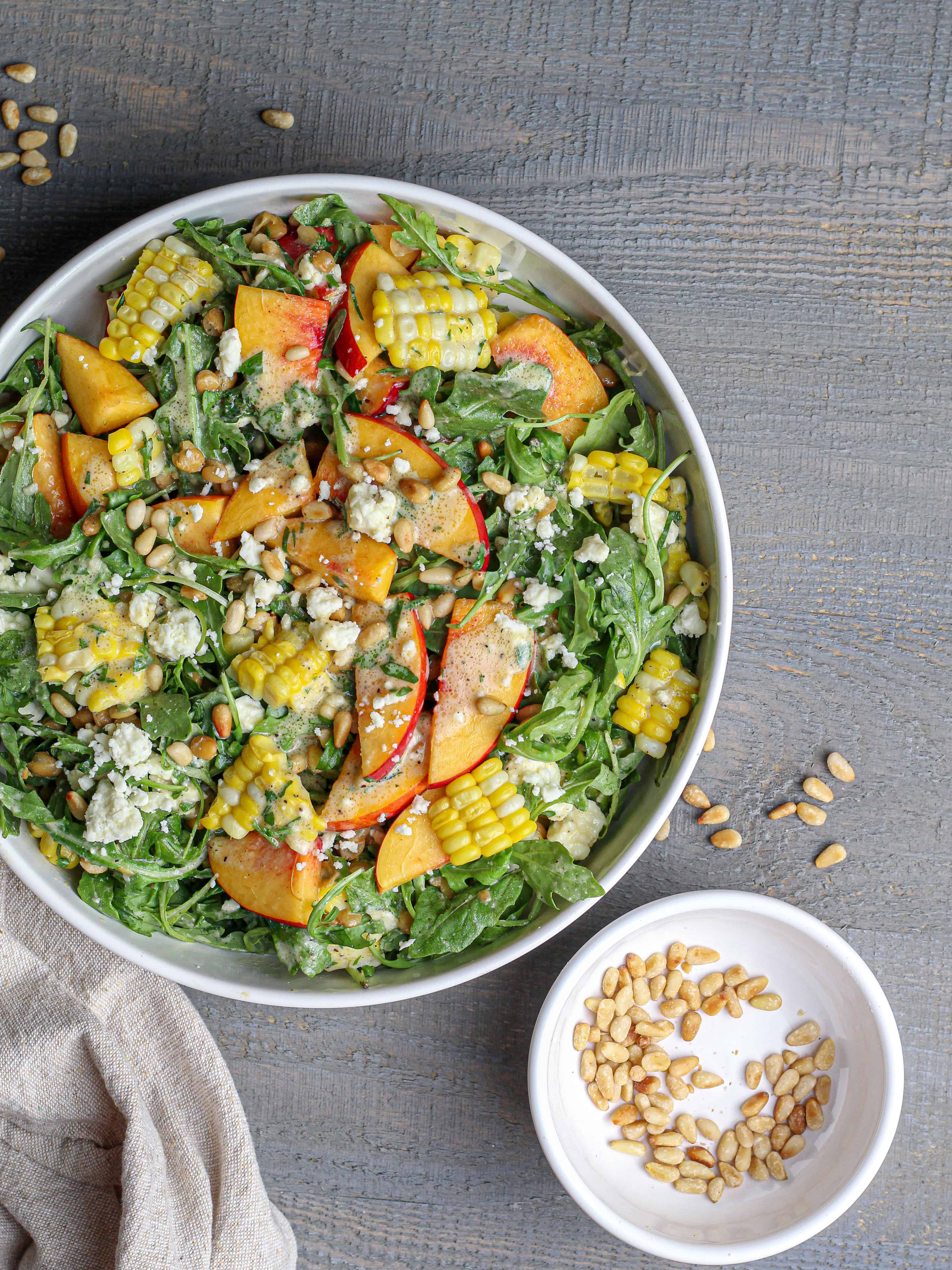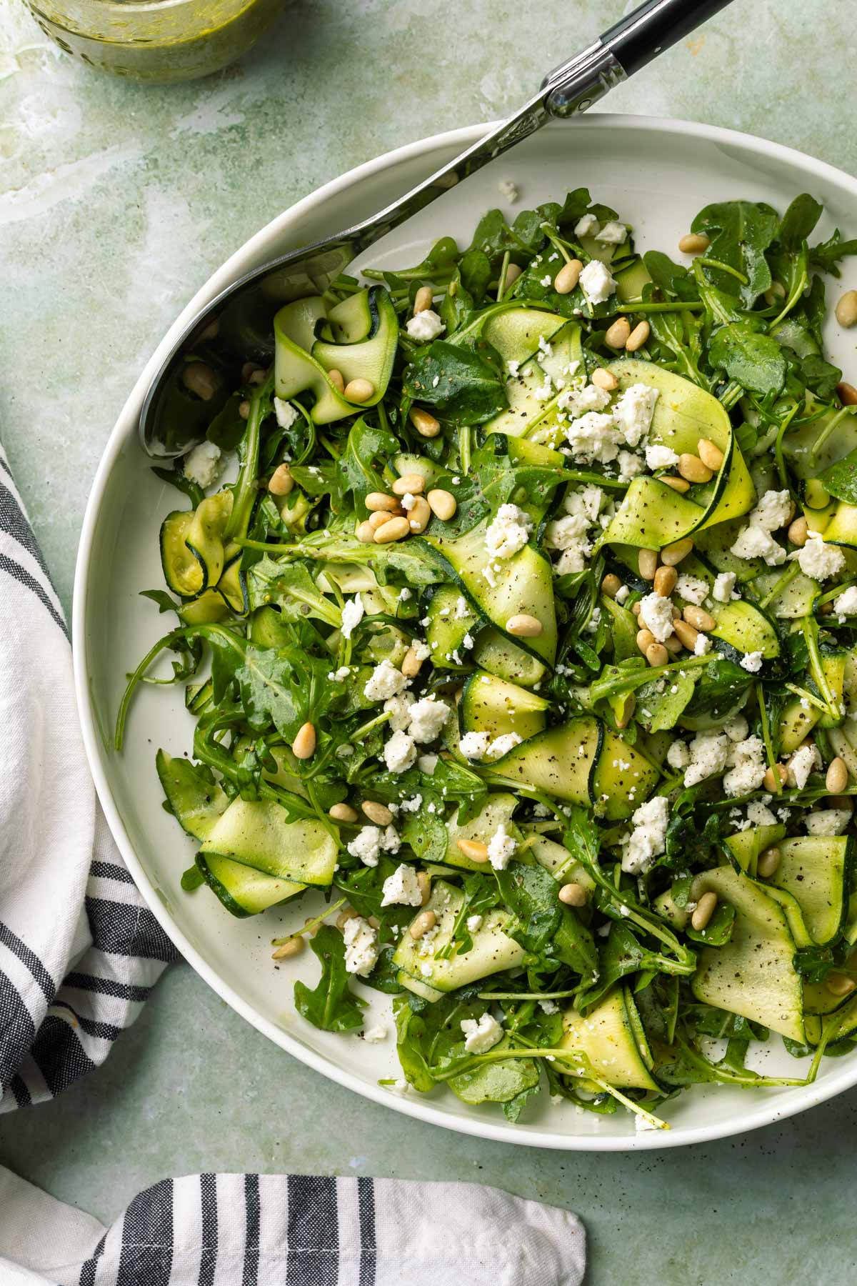 This arugula zucchini salad features toasted pine nuts, dairy free feta and basil vinaigrette for a refreshing and easy summer salad.