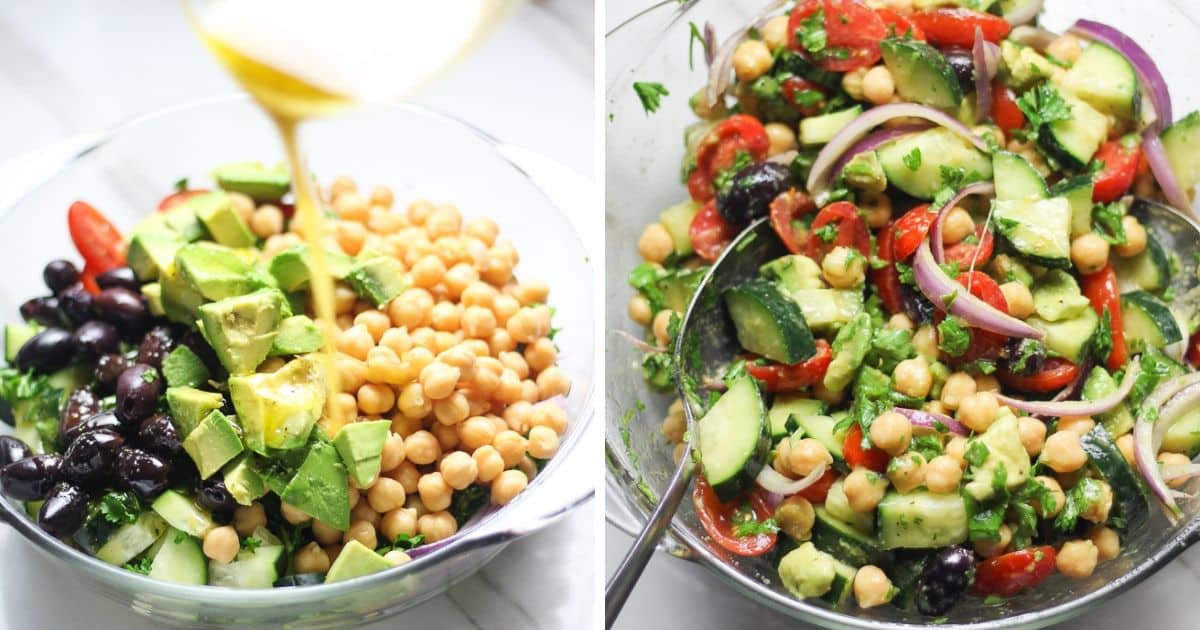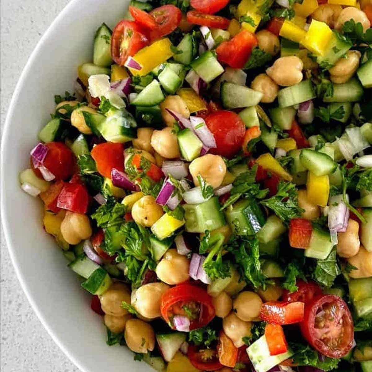 Israeli salad is a chopped salad packed with vibrant vegetables, chickpeas, and fresh herbs in a lemony dressing. You will love this Israeli salad recipe!