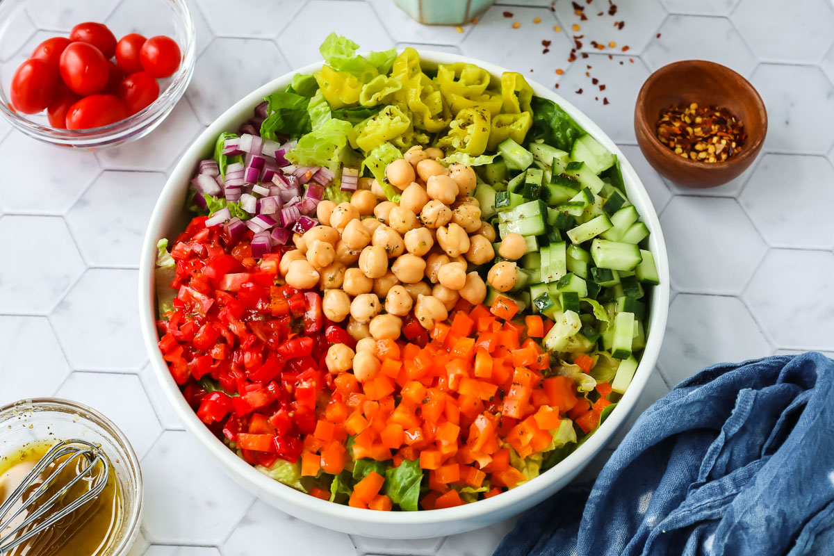 This vegan chopped salad is filled with a colorful mix of crunchy vegetables, spicy pepperoncini, and hearty chickpeas for a tasty salad that can be served as a side dish or a main dish!