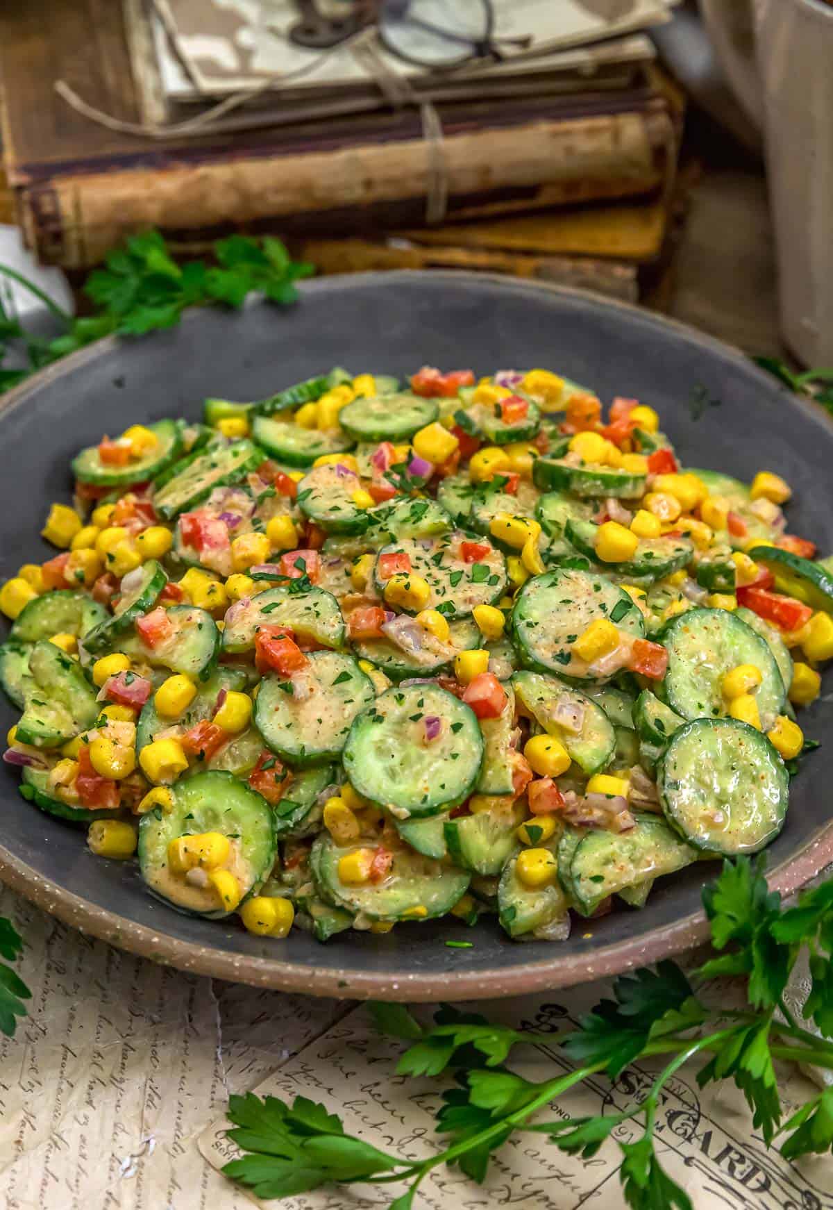 This Vegan Creamy Mexican Cucumber Salad is delicious and a feast for the eyes, featuring a medley of colorful veggies.