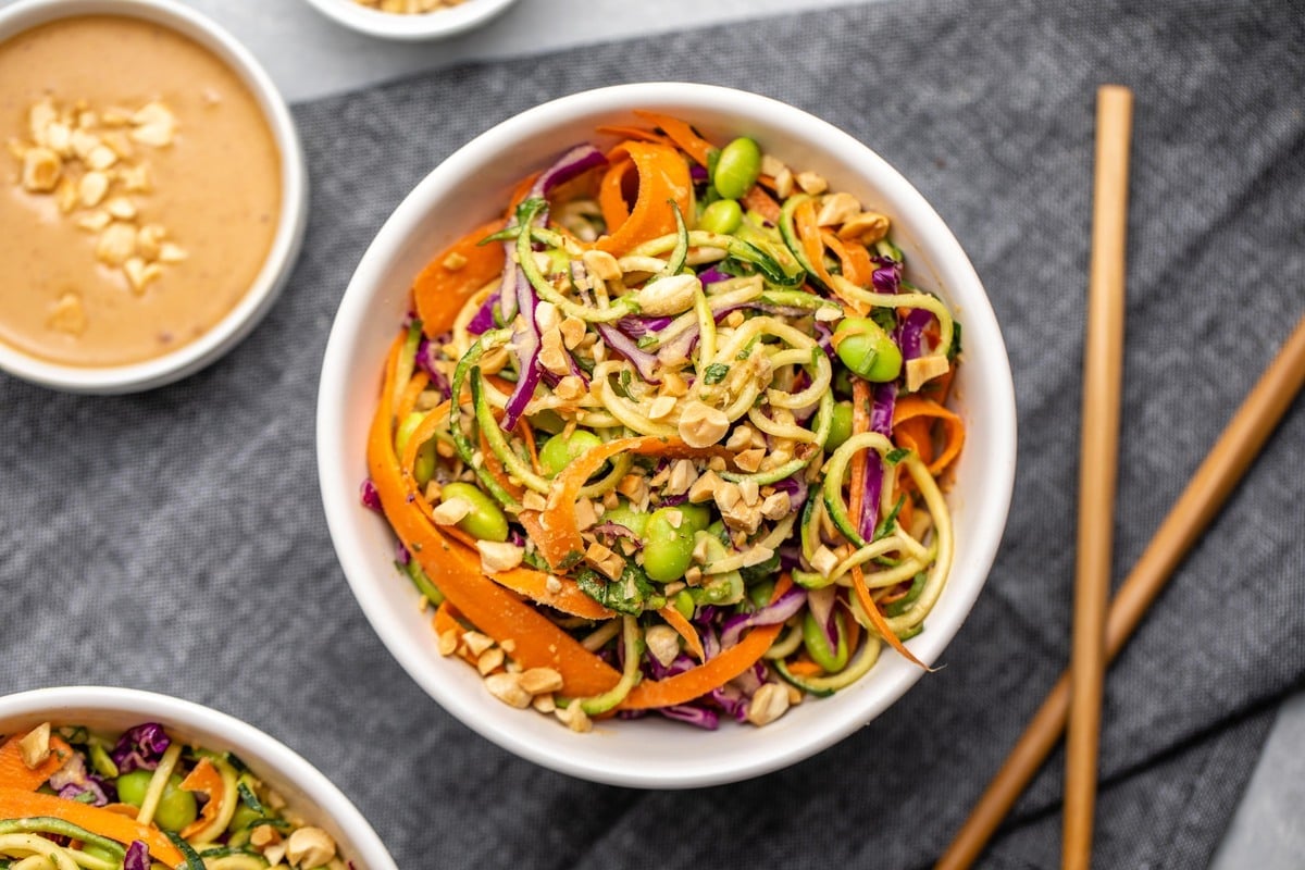 Zucchini noodles combine with, edamame, crunchy veggies, and a spicy peanut sauce to make this fresh, filling, and protein-packed salad!