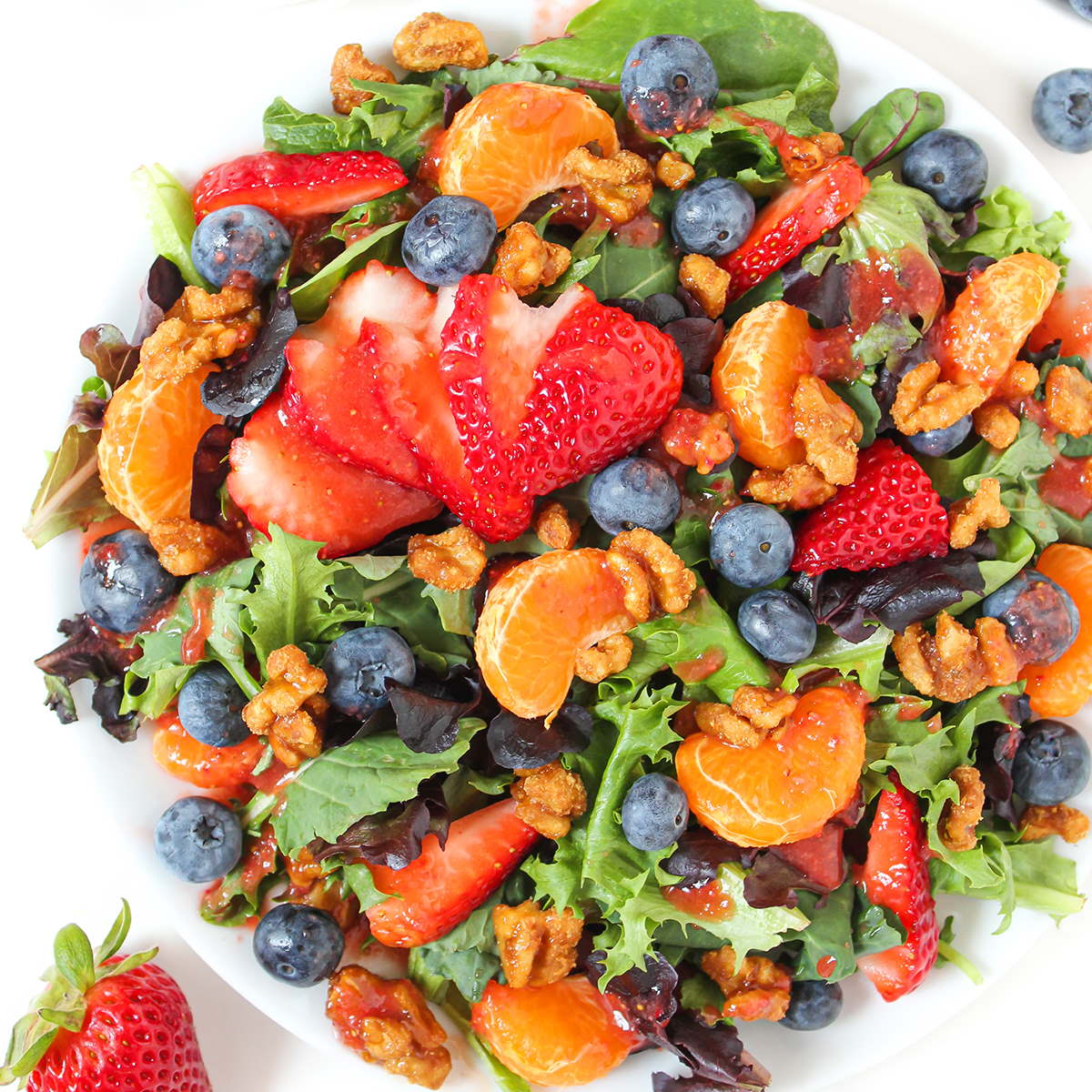 A fresh Berry Salad recipe with crunchy maple-vanilla candied nuts! It’s topped with a strawberry balsamic dressing that’s sweet, tasty, and customizable. (Vegan, gluten-free, oil-free)