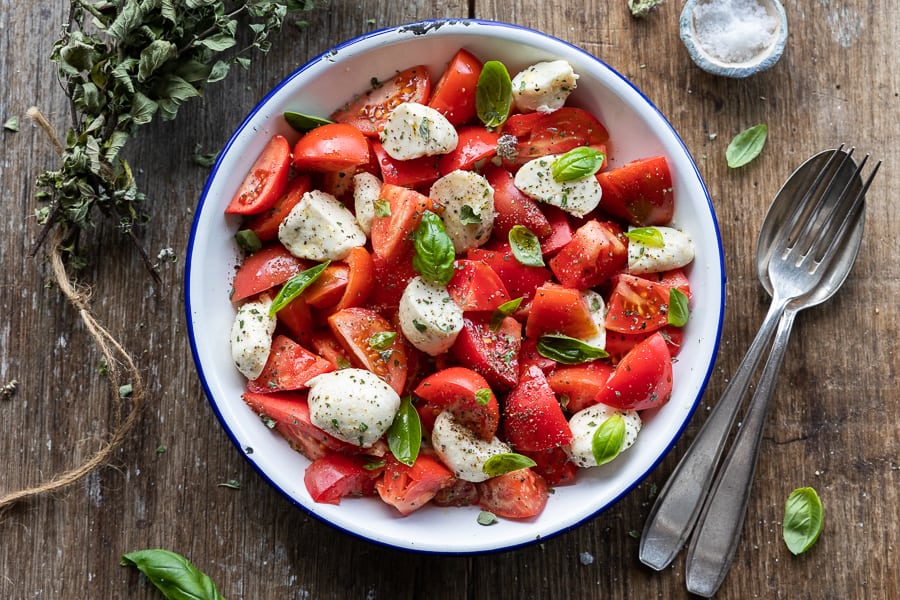 This marinated tomato and avocado salad is a fantastic summer recipe whether you’re barbecuing at home or headed out for a picnic.