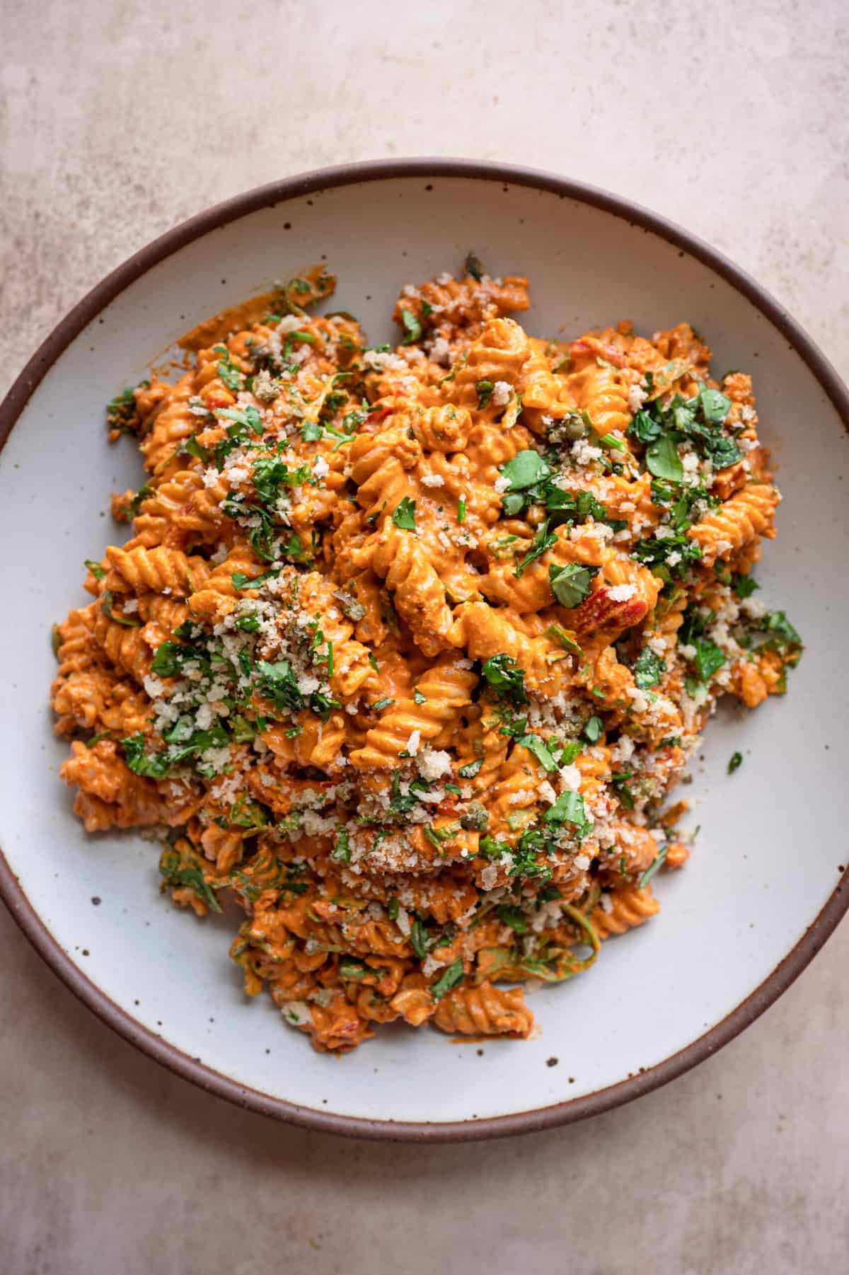 With a smoky red pepper sauce and herby topping, this is no average vegan pasta salad! A must-make for your next summer cookout!