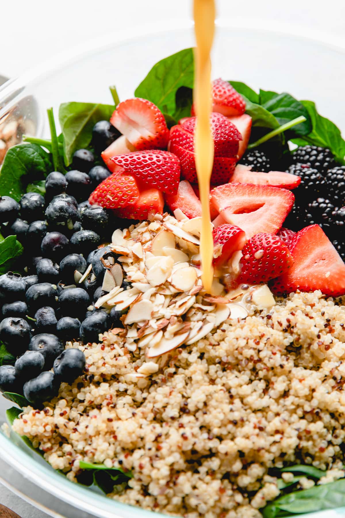 This summer berry salad with spinach and arugula is paired with a maple dijon vinaigrette that gives you the best of both salad worlds, fruits, and greens!