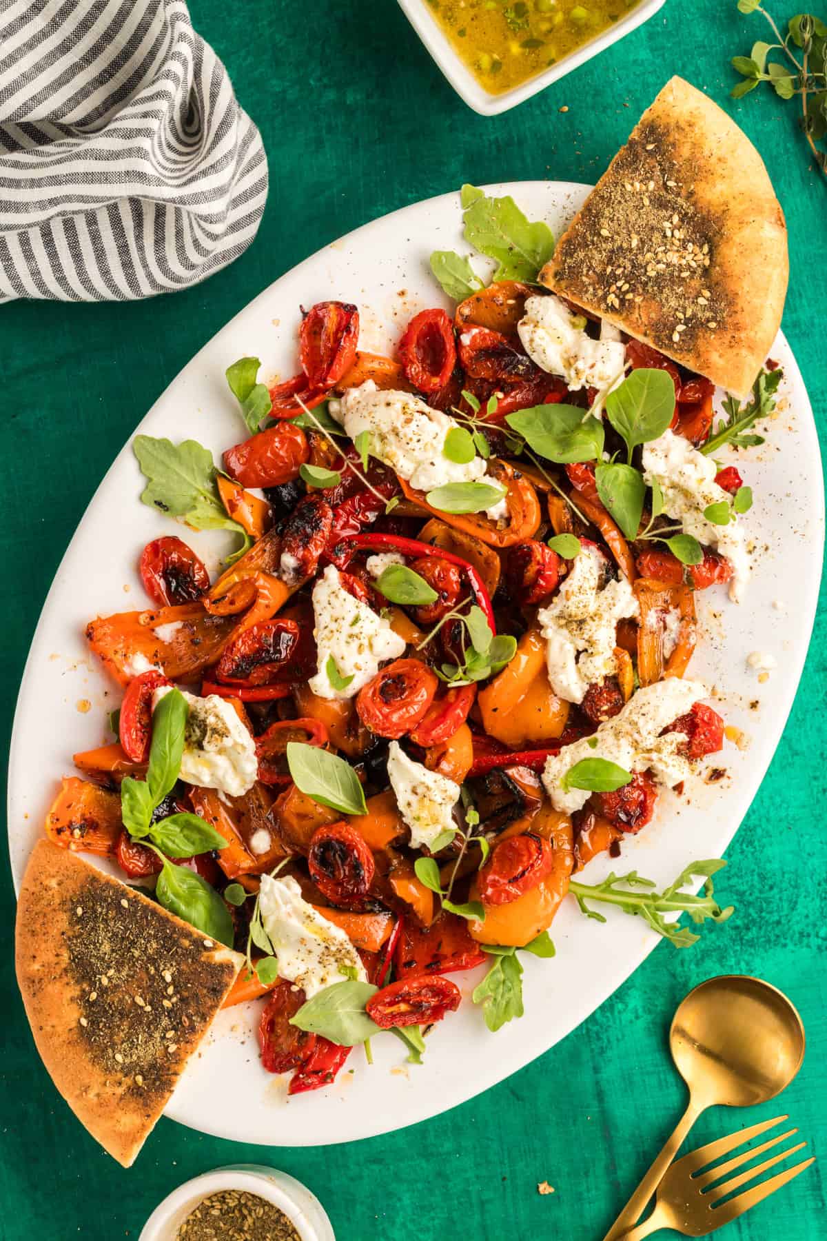 A Roasted Bell Pepper Salad recipe perfect for every day or special occasions. Served with herby vinaigrette and Zaatar Pita Chips.