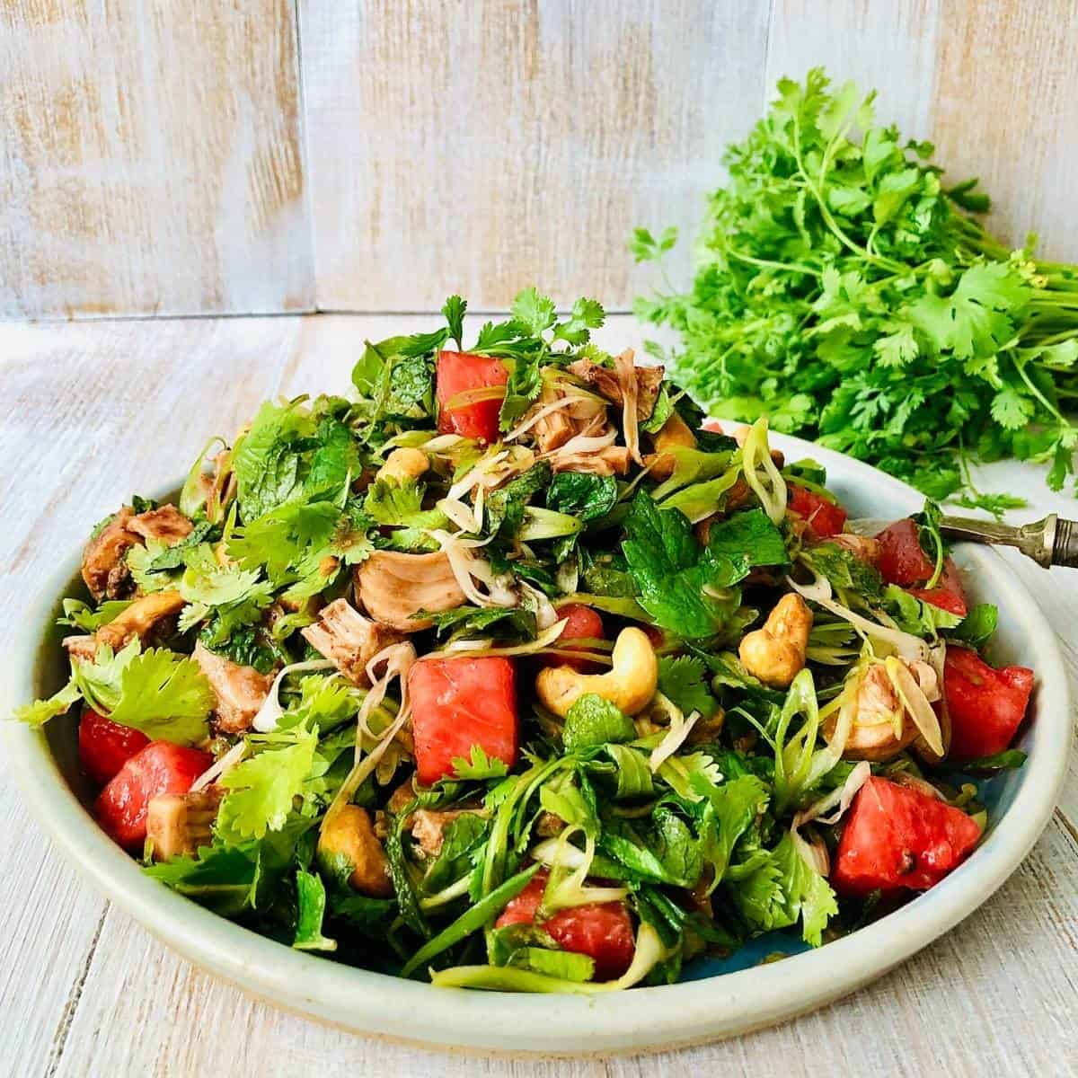 Vegan duck & water melon salad. A delicious herby summer salad with marinated jackfruit as the vegan “duck”!
