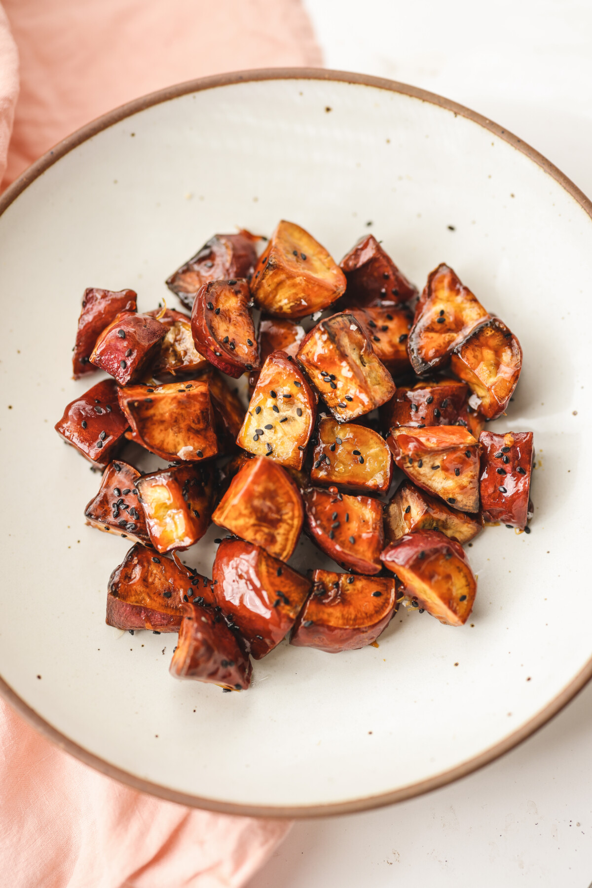 Candied Korean sweet potato is an easy 4-ingredient side dish that’s baked, not fried, for a lighter and healthier gluten-free vegan take.