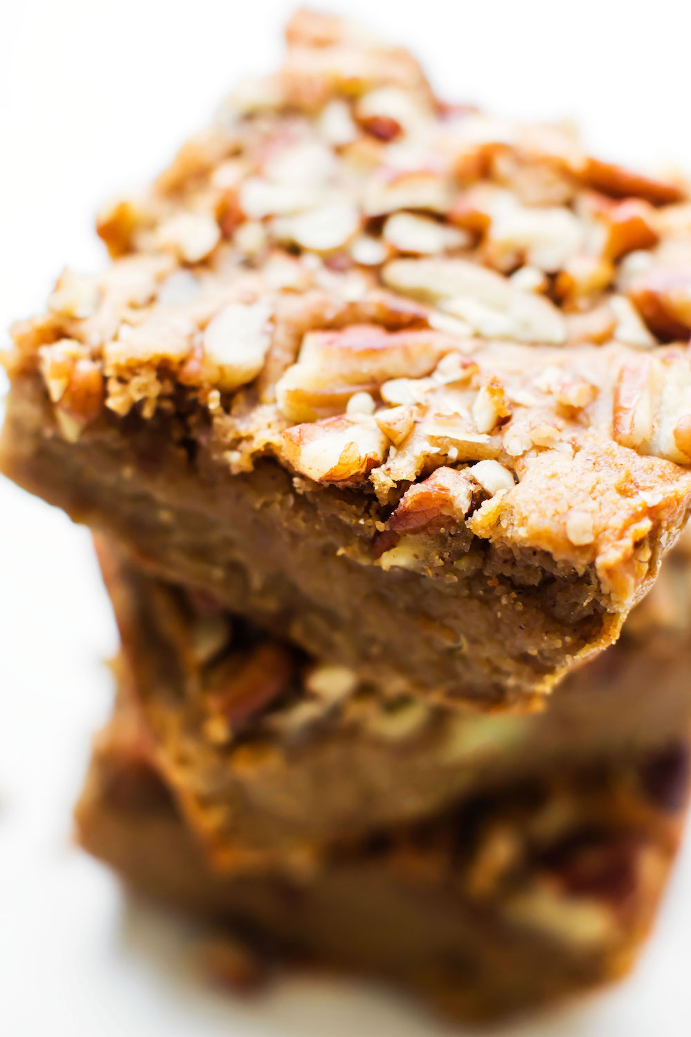 The fudgy texture of a brownie and the sweet vanilla flavor of cake combine into the perfect cinnamon-spiced nut-sprinkled Sweet Potato Blondie squares!