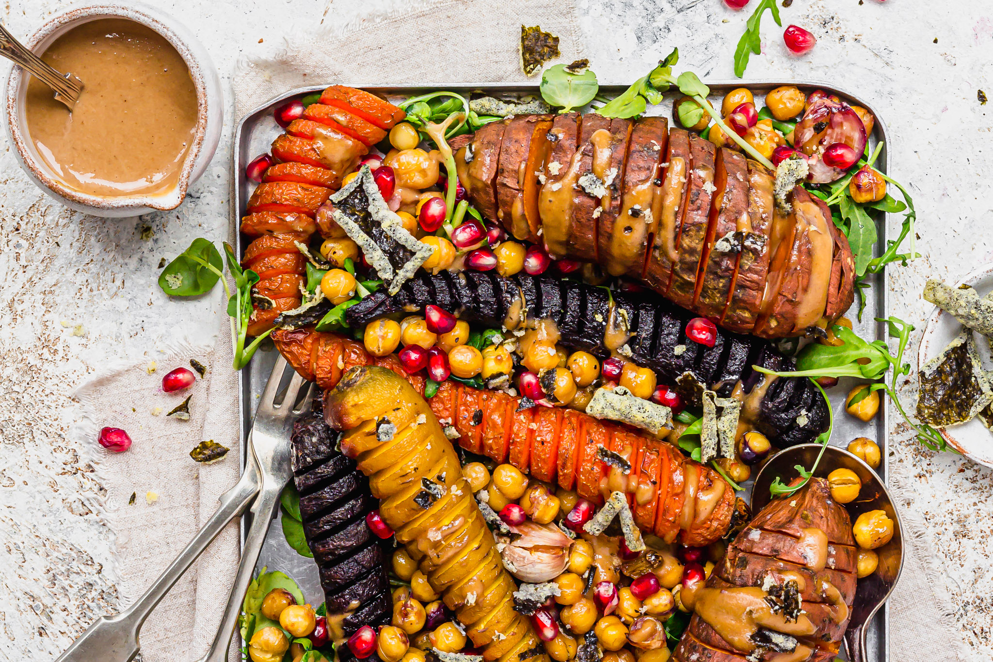Hassleback Sweet Potato and Chickpea Traybake with Tahini (Vegan GF) - Nourishing Amy